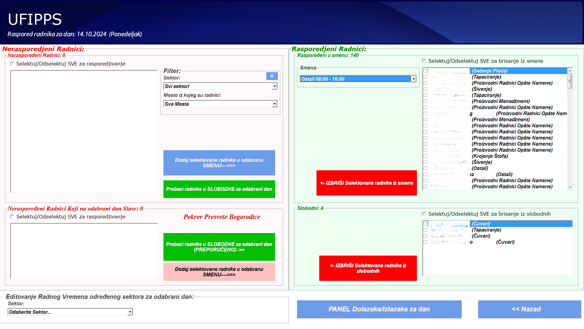 Dnevni raspored po smenama, gde postoji generalni plan smena sa mogućnošću definisanja posebnih smena za sektore. ↓