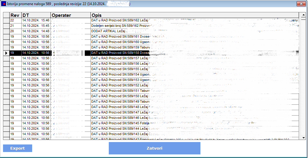 Pored pretraga, za sve kritične procese se vode log-ovi promena (promene na porudžbinama, radnim nalozima, tovarnim listama, magacinu).